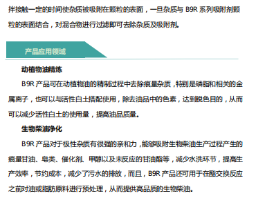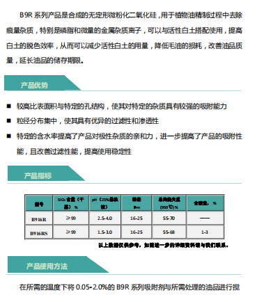 产品特点:B9 R系列产品是合成的无定形微粉化二氧化硅,用于植物油精制过程中去除痕量杂质,特别是磷脂和微量的金属杂质离子,可以与活性白土搭配使用,提高白土的脱色效率,从而可以减少活性白土的用量,降低毛油的损耗,改善油品质量,延长油品的储存期限。